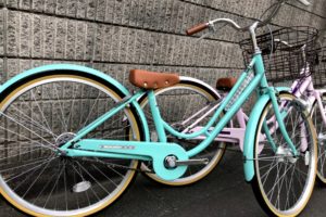 丸石サイクル リズミック 入荷しました。 カラーリングはパステルカラーのピンク・ミントに、 鮮やかなネイビーの3色です。カラフルなフレームをブラウンのサドル、グリップ、バスケットに、あめ色サイドのタイヤで落ち着かせていま …